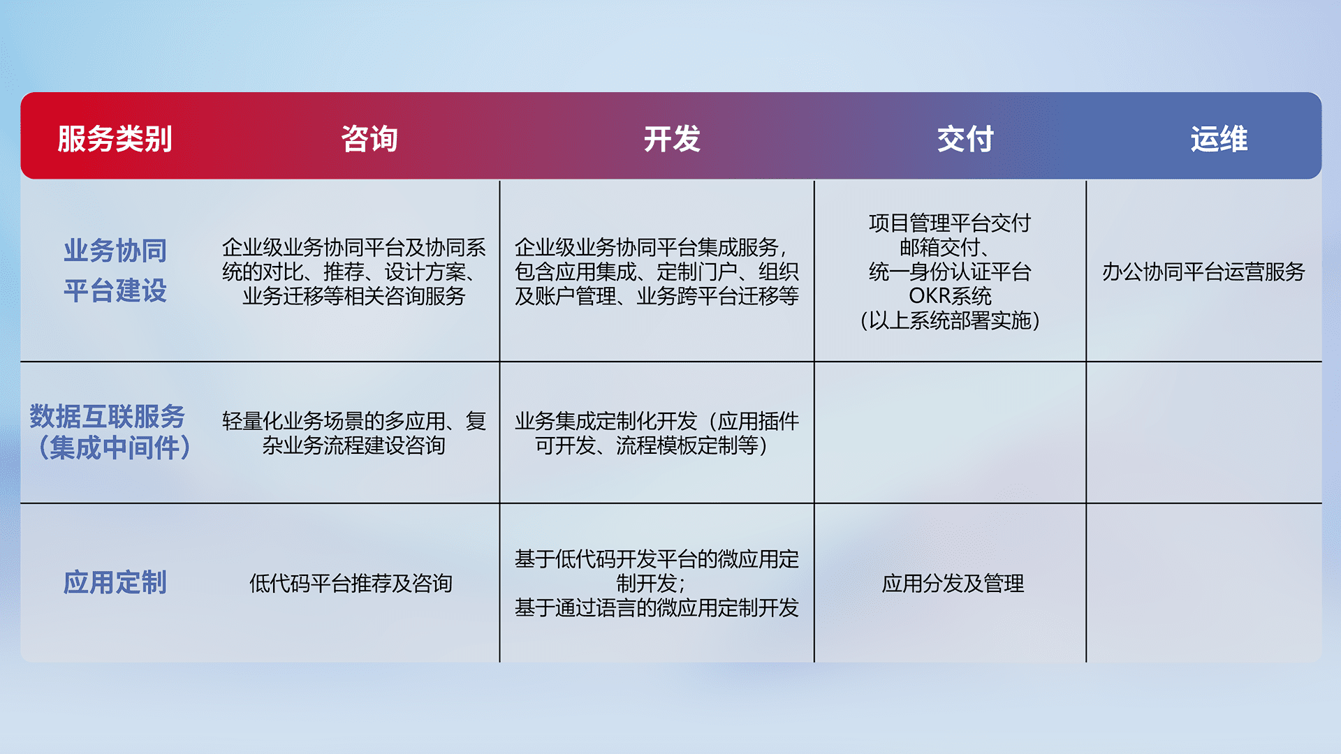 针对钉钉、、企微、、、IDaas等平台级产品提供产品的规划、、、方案、、、交付、、、定制化开发等服务,,实现如统一协同办公、、、智能客户服务、、、混合会议管理、、、智能数据查询、、等业务场景,,,,实现数字化转型。。